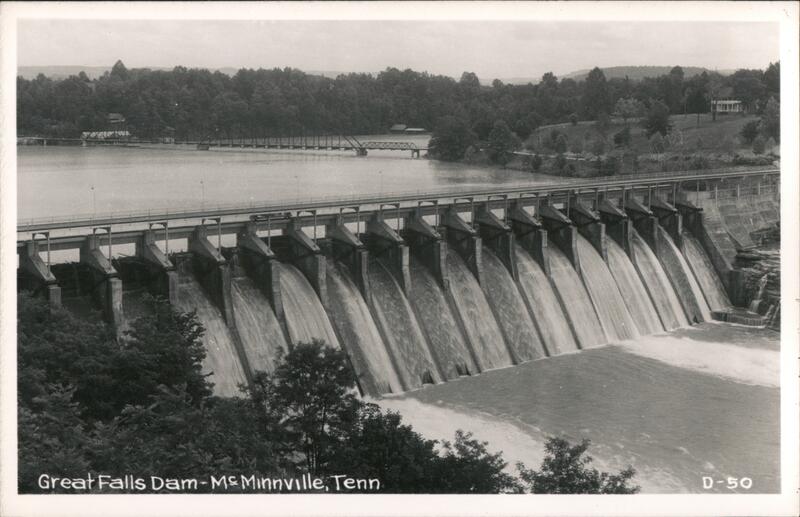 Water flows over the Great Falls Dam. A bridge crosses the river in the background, and a house is visible on the far bank.