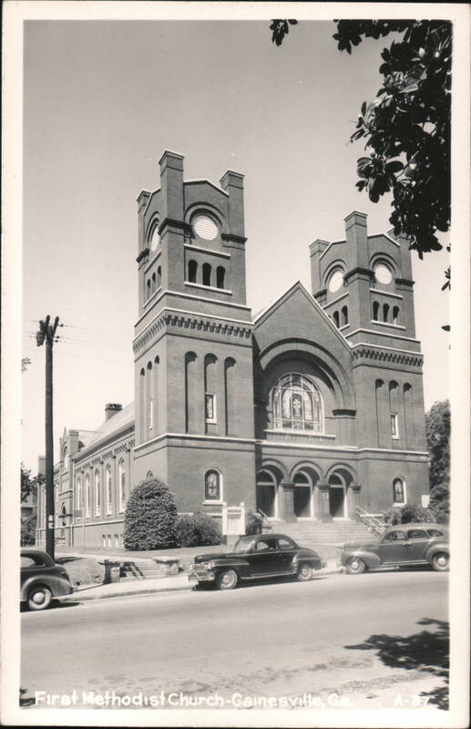 A view of the First Methodist Church in Gainesville, Georgia. Several cars are parked along the street in front of the church.