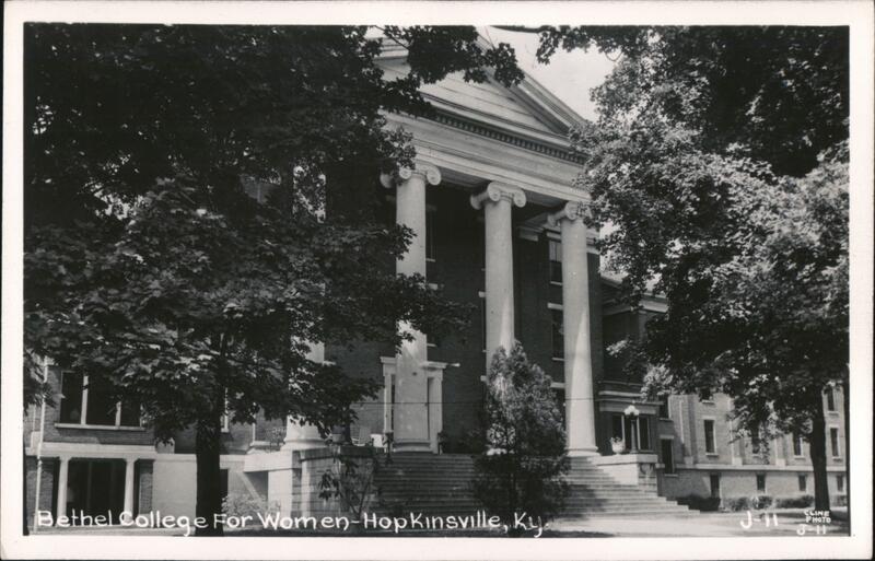 A view of the entrance to Bethel College for Women in Hopkinsville, Kentucky. Large columns and steps lead to the entrance. Trees and shrubs are visible in the foreground.