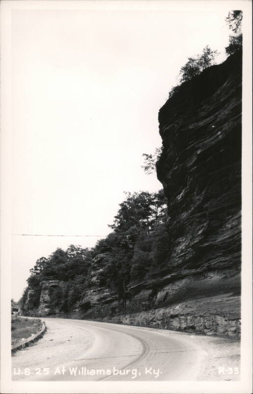 A view of U.S. Route 25 as it curves around a large rock face near Williamsburg, Kentucky. Trees grow atop the rock face and along the roadside.