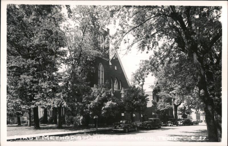 A view of the First Methodist Church in Franklin, Tennessee. Several cars are parked along the street in front of the church. Mature trees line the street and sidewalk.