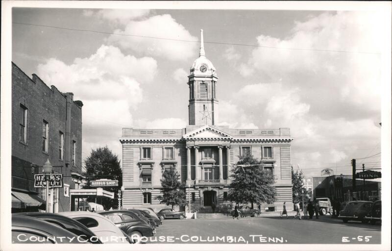 A view of the Maury County Courthouse in Columbia, Tennessee. Cars are parked in front of the courthouse and along the street. Businesses are visible along the street, including Hem's Jewelry and a barber shop.