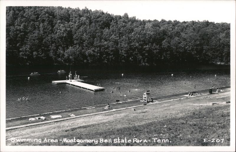 People enjoy the swimming area at Montgomery Bell State Park. A dock with a diving board extends into the water. Several people are swimming, and others are relaxing on the shore. A wooded area borders the far side of the lake.