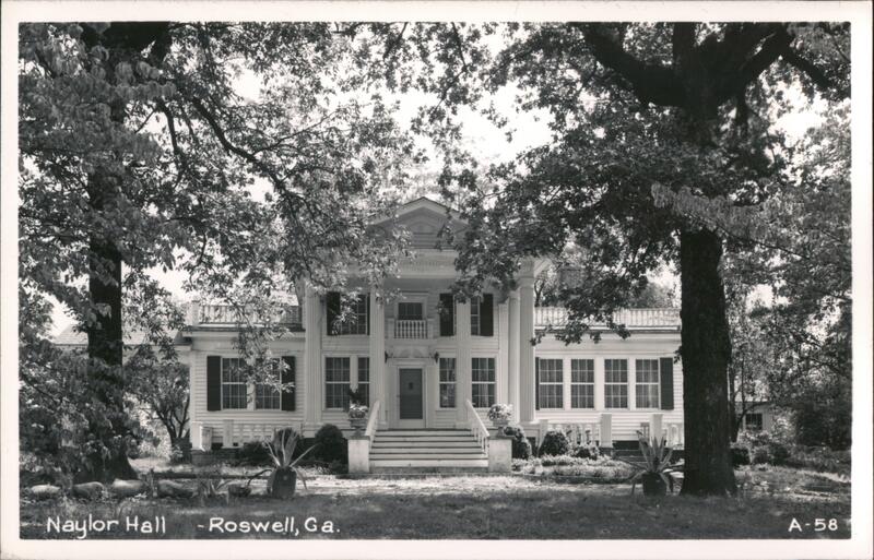 Black and white photo of Naylor Hall in Roswell, GA. Large trees frame the two-story home. The home has large white columns across the front and a staircase leading to the front door.
