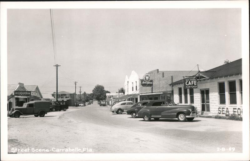 A view of a street in Carrabelle, Florida. Several cars are parked along the side of the road. Buildings line the street, including a cafe, liquor store, and appliance store.