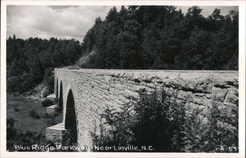 A view of a stone bridge viaduct along the Blue Ridge Parkway near Linville, North Carolina.