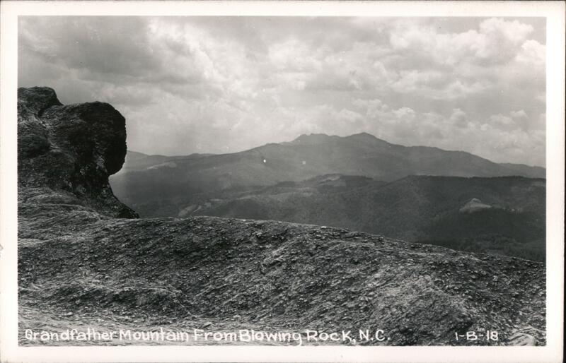 A view of Grandfather Mountain from Blowing Rock. The rocky foreground leads to a view of the mountain range in the background. There are puffy clouds in the sky.