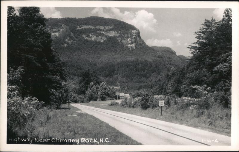 A view of a two-lane highway approaching Chimney Rock. A school zone sign is visible on the right side of the road.