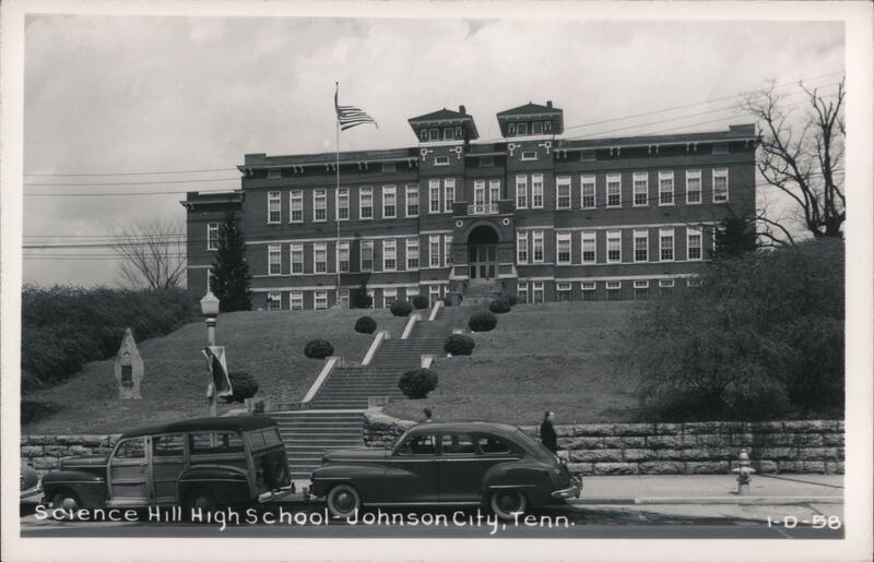 An image of Science Hill High School. There is an American flag flying, two vintage cars parked in front, and a person walking on the sidewalk.