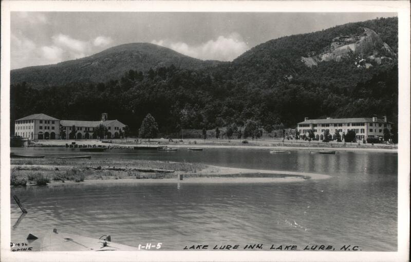 A view of the Lake Lure Inn and the lake, with mountains in the background.