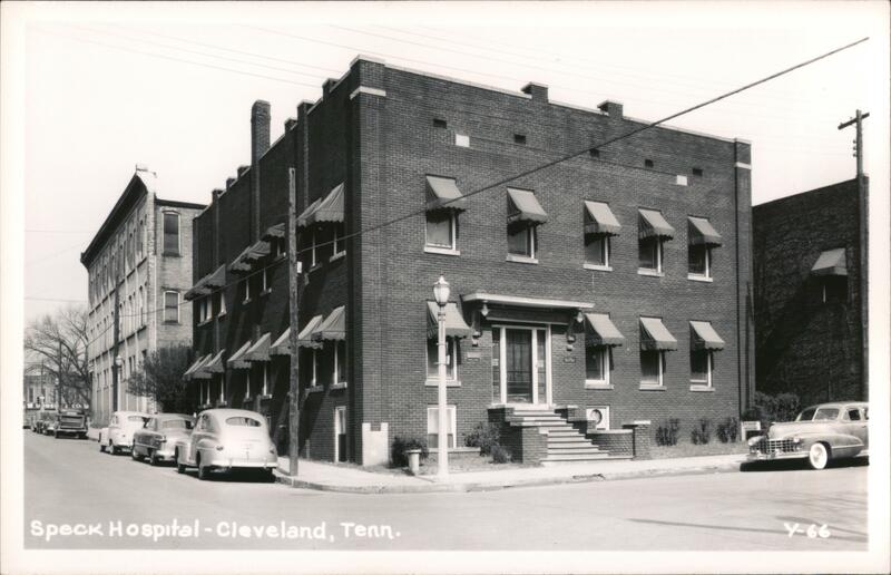 A view of Speck Hospital in Cleveland, Tennessee. Cars are parked along the street in front of the building. A vintage car is parked on the side street. There are awnings over the windows of the hospital.