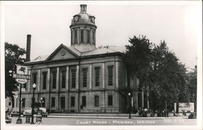 | A view of the Jefferson County Courthouse in Madison, Indiana. A Mobilgas sign is visible on the left. Cars are parked on the street in front of the courthouse. Several people are standing on the sidewalk in front of the courthouse. A sign advertising wallpaper is visible on the right. |