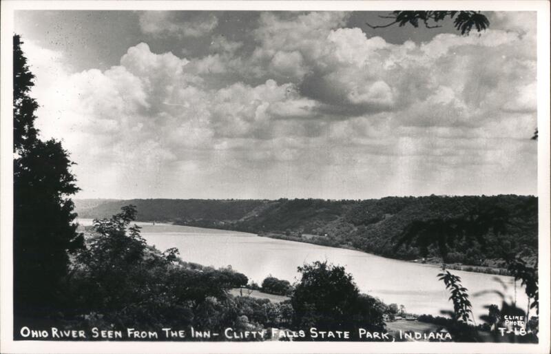 A view of the Ohio River from the Inn at Clifty Falls State Park. There are puffy cumulus clouds in the sky.