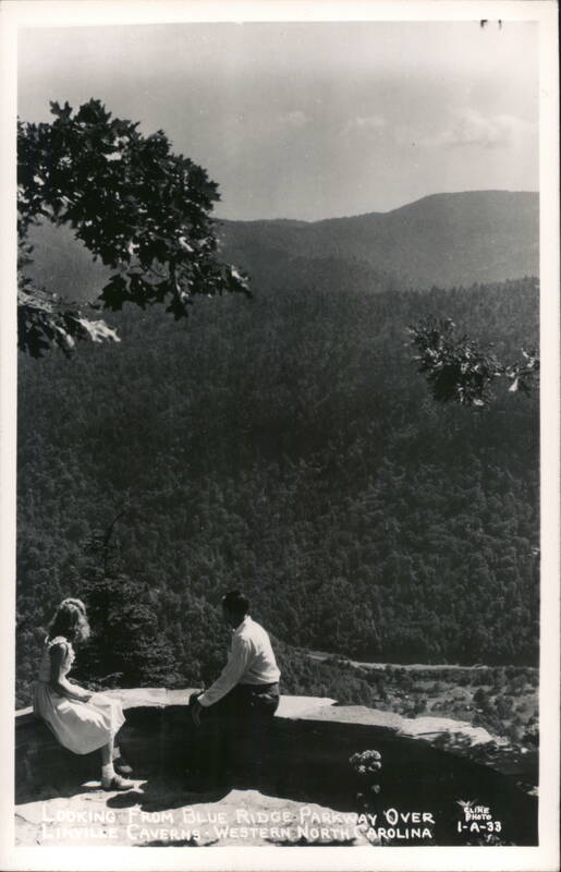 A man and a young girl look out over the forested valley from an overlook along the Blue Ridge Parkway. Text along the right side reads, "LOOKING FROM BLUE RIDGE PARKWAY OVER LINVILLE CAVERNS - WESTERN NORTH CAROLINA".