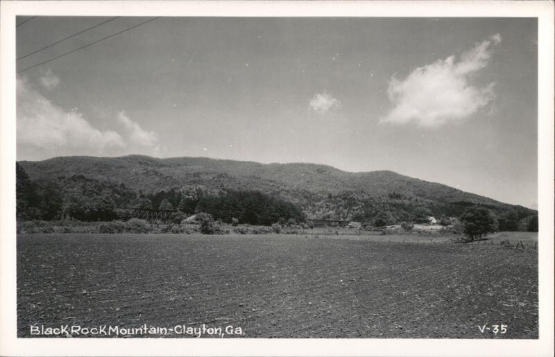 A view of Black Rock Mountain in Clayton, Georgia. A railroad trestle can be seen in the mid-ground, and a plowed field is in the foreground.