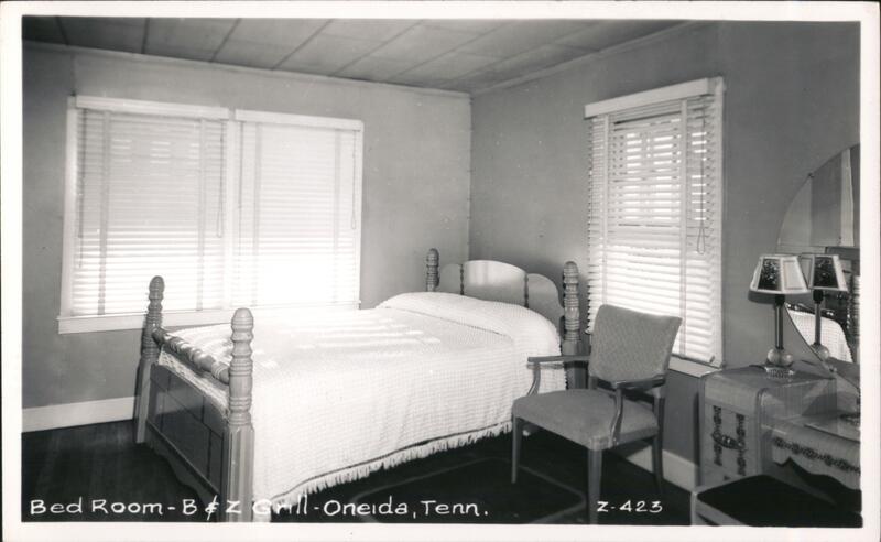 Vintage view of a bedroom at the B&Z Grill in Oneida, Tennessee. The room features a bed with a textured bedspread, a chair, a vanity with a mirror and lamps, and windows with Venetian blinds.