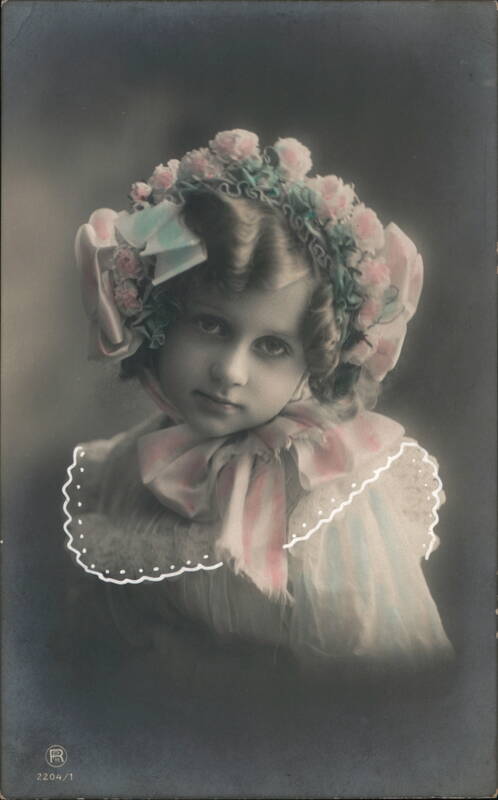 A young girl poses for a portrait wearing a bonnet adorned with pink and light blue flowers and ribbons. She also wears a pink and light blue striped scarf with a scalloped, lace-trimmed collar.