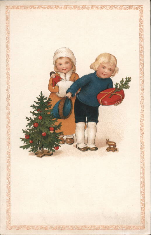 Antique Christmas Postcard, Children with Gifts and Tree