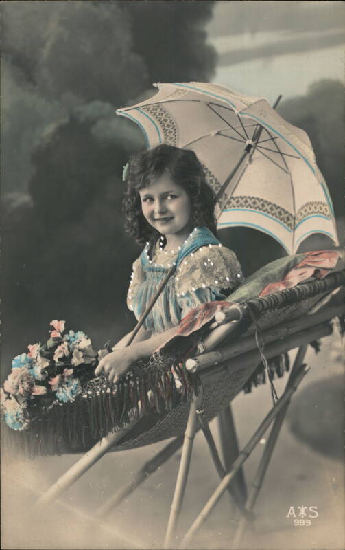 A young girl sits in a wicker chair or swing, holding a parasol and a bouquet of flowers. She wears a light-colored dress with darker trim and has a bow in her hair.