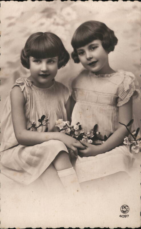 Two young girls, likely sisters, pose for a portrait. They wear similar light-colored dresses with pleated details and short sleeves tied with ribbons at the shoulders. Their dark hair is styled in matching bobs. They hold a branch with light-colored blossoms between them.