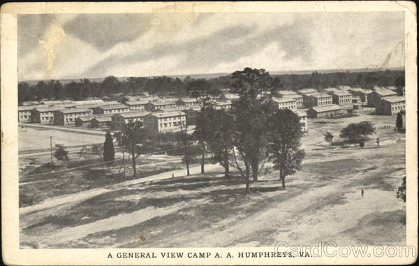 Front: A GENERAL VIEW CAMP A. A. HUMPHREYS, VA. Back: THE HAMENT-ROMANS COMPANY Phoenix Building, Baltimore, Md. QUALITY Quaters/fere for 100,000 men. Leonard Hills World War HERE