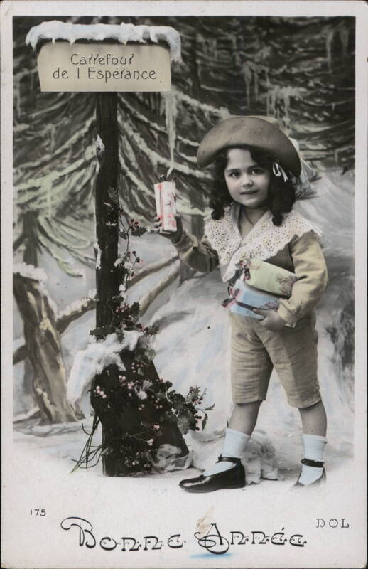 Front: 175 Carrefour de | Espérance Bonne Annéc DOL Back: Levelezo-lap REPUBLIQUE FRANÇAISE Postkarto Briefkaa Vos meilleurs souhaits Ma M Monsieur et Madame Rosty Gauthiy St Paches les fauks M. et M. Chevillot S+ Aube
