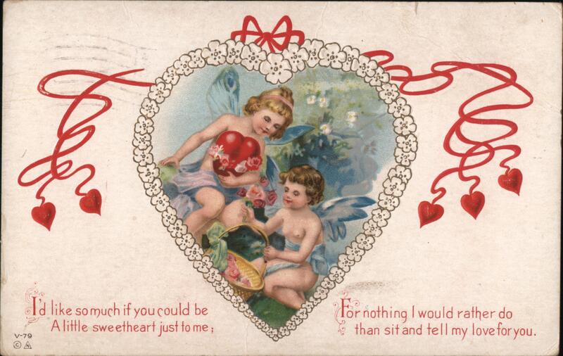 Two cherubs, one with fairy wings, in a heart-shaped frame decorated with small white flowers. One cherub holds a red heart, the other a basket of pink roses. Red ribbons and hearts decorate the frame. Text at the bottom reads: "I'd like so much if you could be A little sweetheart just to me; For nothing I would rather do than sit and tell my love for you." |
