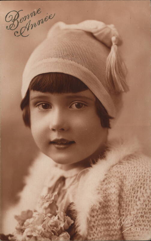 Sepia-toned portrait of a young girl wearing a knit cap with a tassel and a fuzzy sweater, holding a bouquet of flowers. "Bonne Annee" is written in cursive script at the top left.
