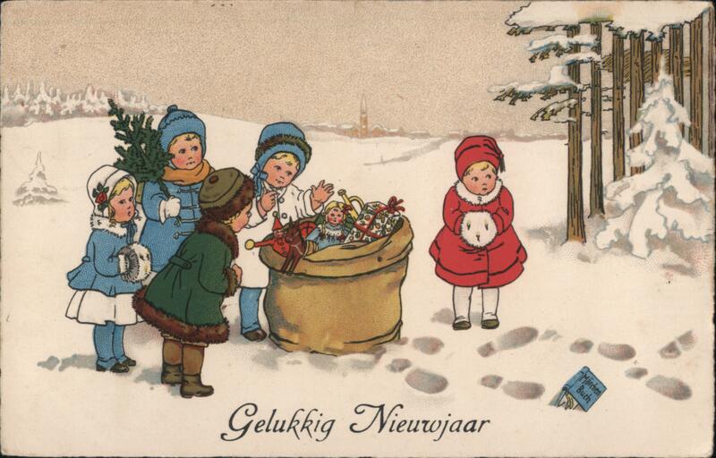 Five children stand in the snow. One child in a red coat approaches the others, who are gathered around a barrel full of Christmas gifts. One child carries a small Christmas tree. Footprints in the snow lead to the child in red. "Gelukkig Nieuwjaar" is written at the bottom. |