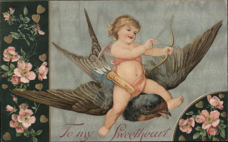 A cherubic cupid, perched atop a swallow in flight, aims his bow and arrow. The cupid wears a pink sash and carries a quiver. The background is a textured light blue, bordered by a dark green panel decorated with pink flowers and gold hearts.