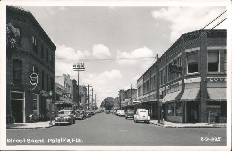 A vintage street scene in Palatka, Florida. Several cars are parked along the street, and various businesses are visible, including Strickland Drugs, Western Auto Associate Store, Sewell's Hardware, and Lovett's. Utility poles and wires line the street. |