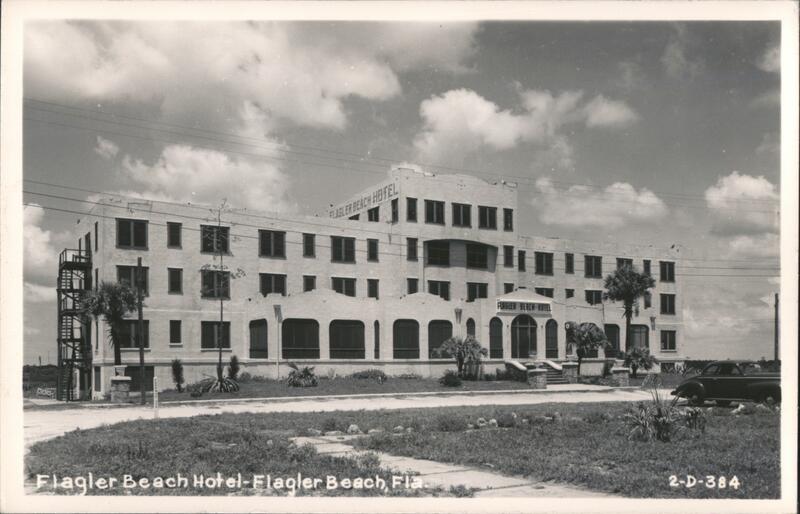 The Flagler Beach Hotel, a multi-story building with arched entryways and a sign bearing its name. A vintage car is parked on the street in front. Power lines cross above the building.