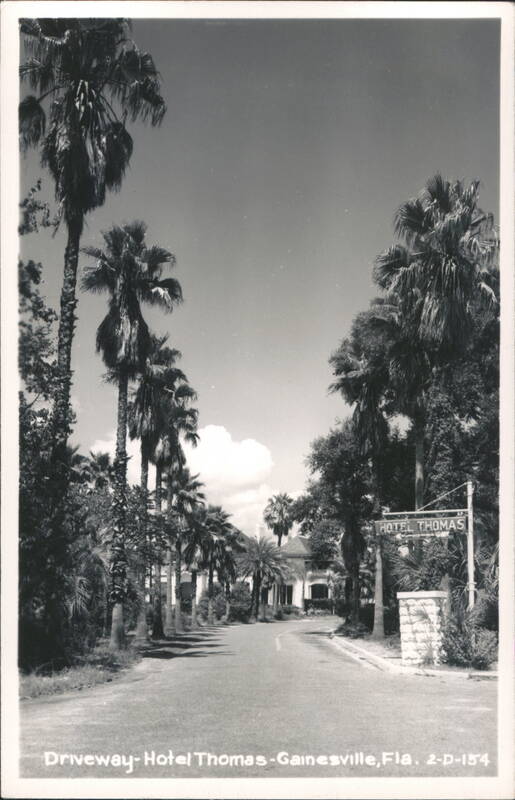 A view of the driveway leading to the Hotel Thomas in Gainesville, Florida. The driveway is lined with palm trees.