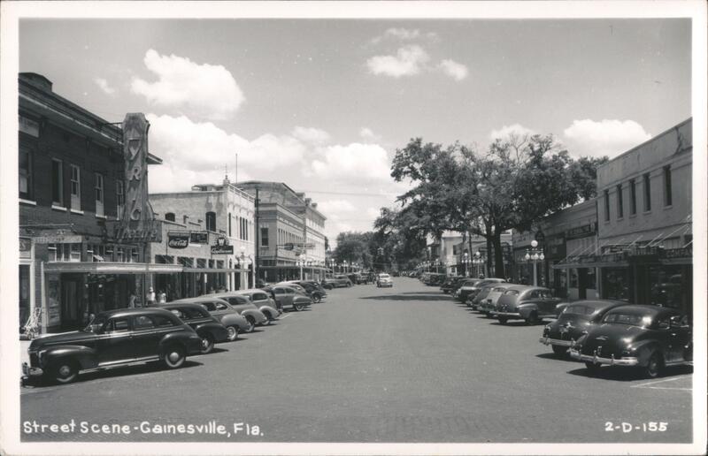 | A vintage postcard view of a street scene in Gainesville, Florida. Cars are parked along the street, and businesses line the sidewalks. A theater is visible on the left side of the street. Trees are present along the sidewalk, and the sky is cloudy. |