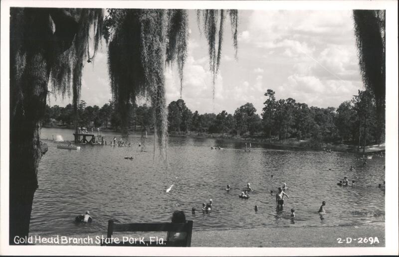 People enjoy swimming in the lake at Gold Head Branch State Park. Spanish moss hangs from a tree in the foreground.