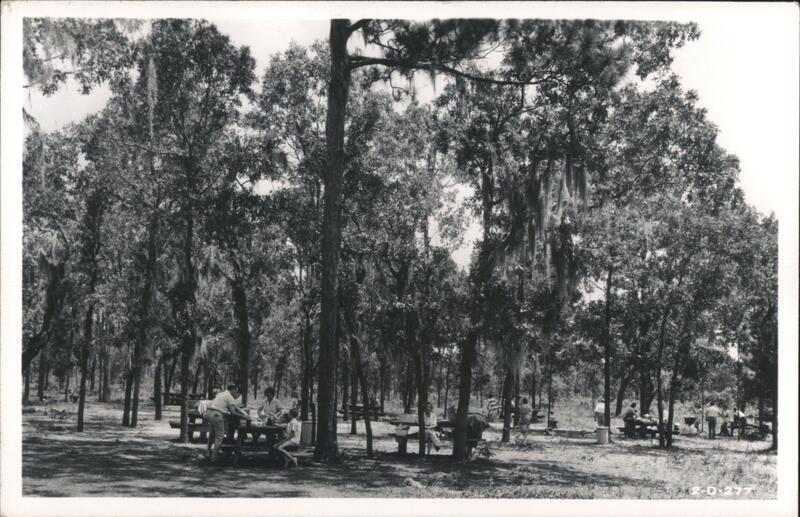 Families enjoy picnics at tables under shade trees. Spanish moss hangs from the branches.