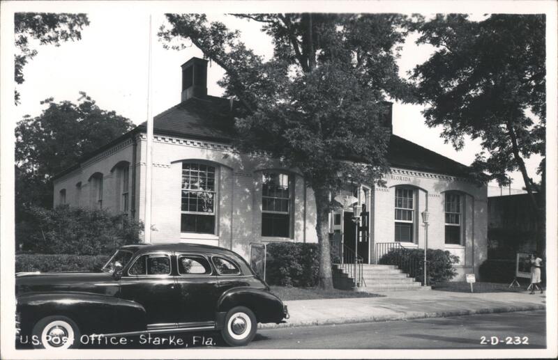 A vintage photograph of the US Post Office in Starke, Florida. A classic car is parked in front of the building, and a woman in a dress is walking on the sidewalk.