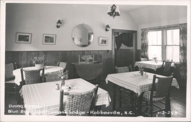 A vintage postcard view of the dining room at the Blue Boar Sportsman's Lodge. Several tables are set with checkered tablecloths, and wicker chairs. A round mirror hangs on the wall, and a hanging lamp is visible on the ceiling.