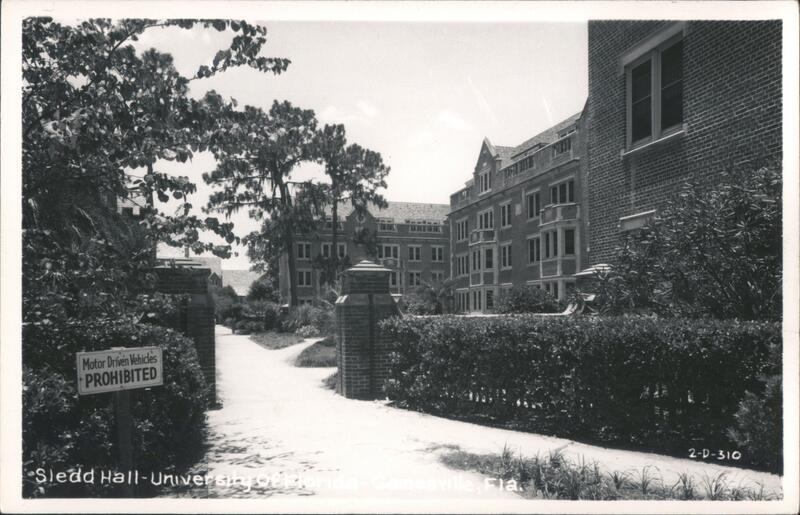A view of Sledd Hall at the University of Florida. A sign indicates that motor-driven vehicles are prohibited.