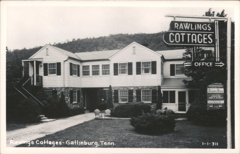 Rawlings Cottages in Gatlinburg, Tennessee. The sign indicates the office and that the cottages are recommended by Duncan Hines, author of Lodging for a Night. The sign also shows approval in 1948.