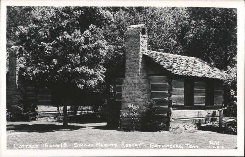 Cabins 18 and 19 at Smoky Heights Resort. Large stone chimneys, wood siding, shingled roofs. Trees and split-rail fences surround the cabins.