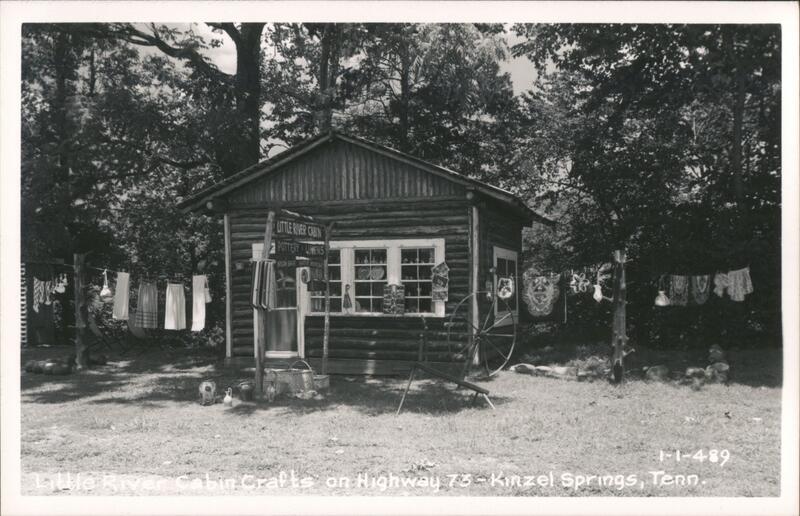 Black and white photo postcard of Little River Cabin Crafts on Highway 73 in Kinzel Springs, Tennessee. The cabin is made of logs. Clothes are hanging on clotheslines on either side of the cabin. Various crafts are displayed in front of the cabin. A sign in front of the cabin says "LITTLE RIVER CABIN, POTTERY, LINENS, NYLON BAGS, NATIVE WOODCRAFT". |