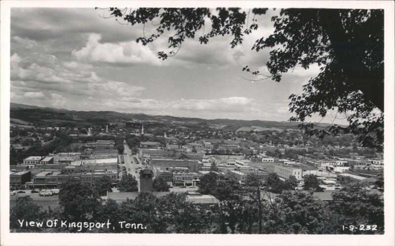A view of Kingsport, Tennessee from a high vantage point. The buildings and streets of the city are visible, as are the surrounding hills and trees. A cloudy sky is above.