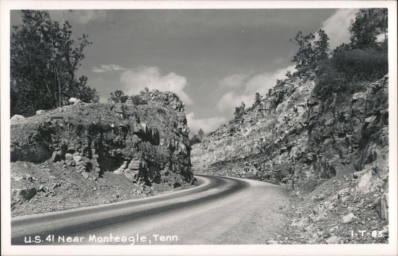 A vintage view of U.S. Route 41 near Monteagle, Tennessee. The two-lane highway curves through a rocky, mountainous landscape. Trees and shrubs grow sparsely on the steep slopes beside the road.