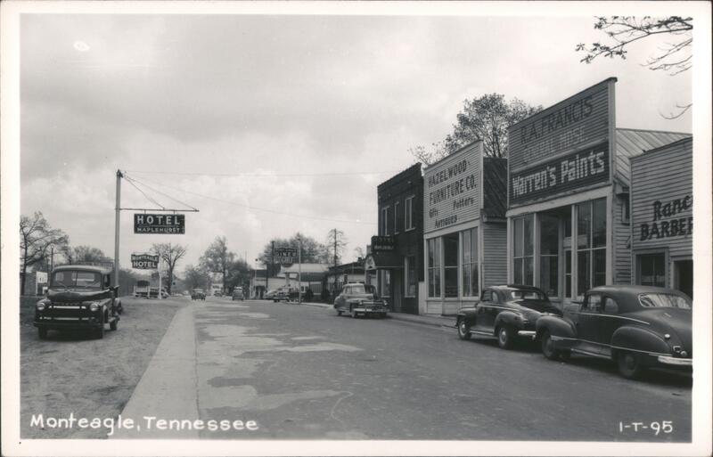 A vintage view of Monteagle, Tennessee, featuring the Hotel Maplehurst, Hazelwood Furniture Co., Warren's Paints, and the Ranch Barber. Cars are parked along the street, and a truck is visible in the foreground. A diner and Gulf gas station signs are also visible. |