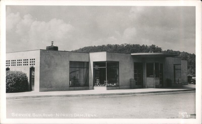 A service building at Norris Dam in Tennessee. The building is made of concrete and has a flat roof. There are large windows on the front and side of the building. There is a small chimney on the roof. There are trees in the background.