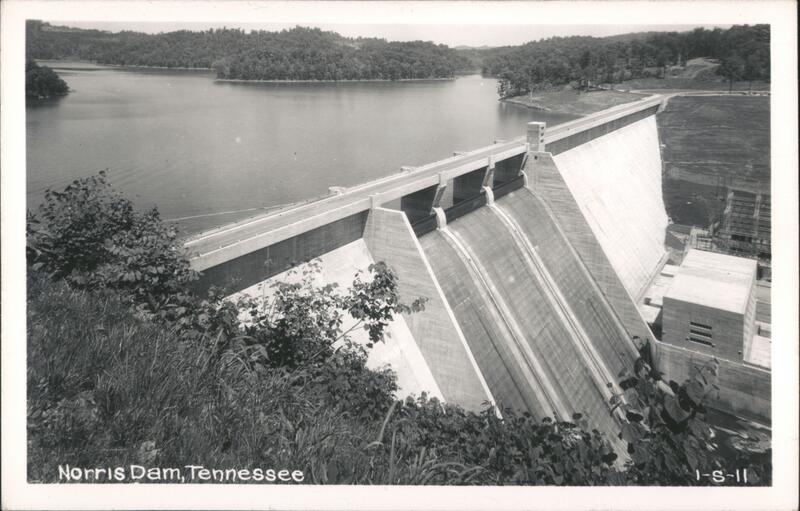 A view of the Norris Dam in Tennessee, showing the dam, the reservoir, and the surrounding forested hills. Water flows over the spillway.