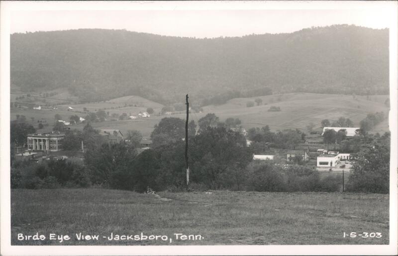 A distant view of Jacksboro, Tennessee, nestled among rolling hills and greenery. A large building with columns stands prominently in the town, surrounded by smaller structures and trees. A utility pole is visible in the foreground.