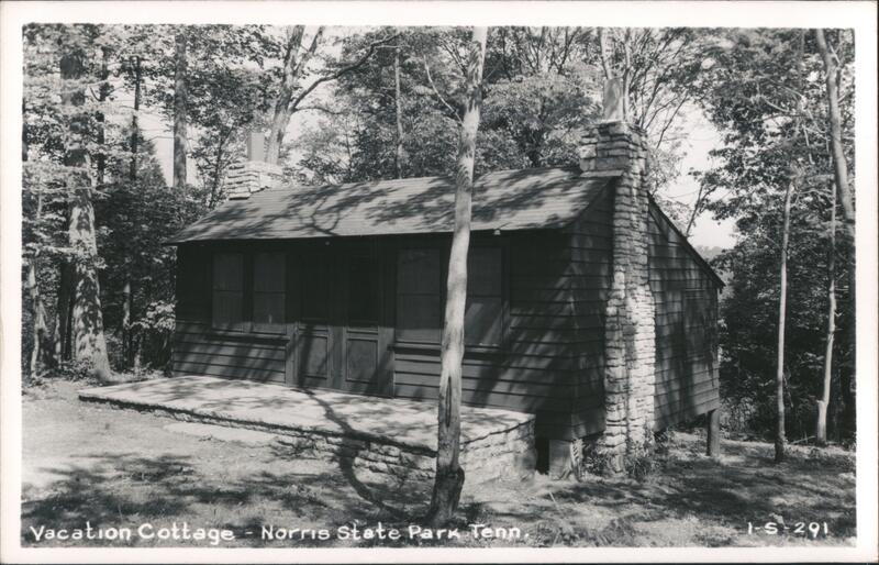 A small, single-story cottage with a stone chimney is nestled among trees.