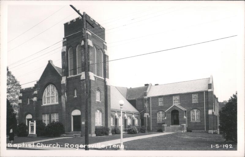 A view of a Baptist Church in Rogersville, Tennessee. A woman can be seen walking on the sidewalk in front of the church.